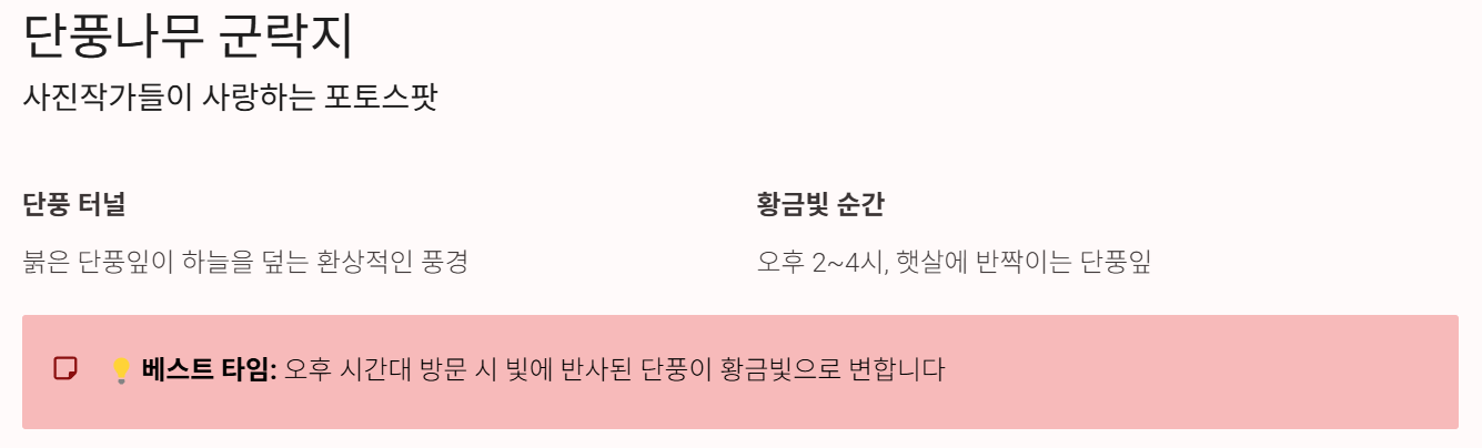 “사진을 찍으면 필터 없이도 인생샷이 나와요. 특히 햇살이 비치는 오후엔 단풍잎이 유리처럼 반짝여서 너무 예뻤어요. 커플 여행이나 가족 사진 찍기 딱 좋은 곳이에요.”