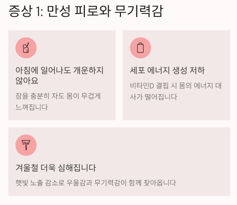 이처럼 피로감은 단순한 과로가 아니라 비타민D 결핍 신호일 수 있습니다.