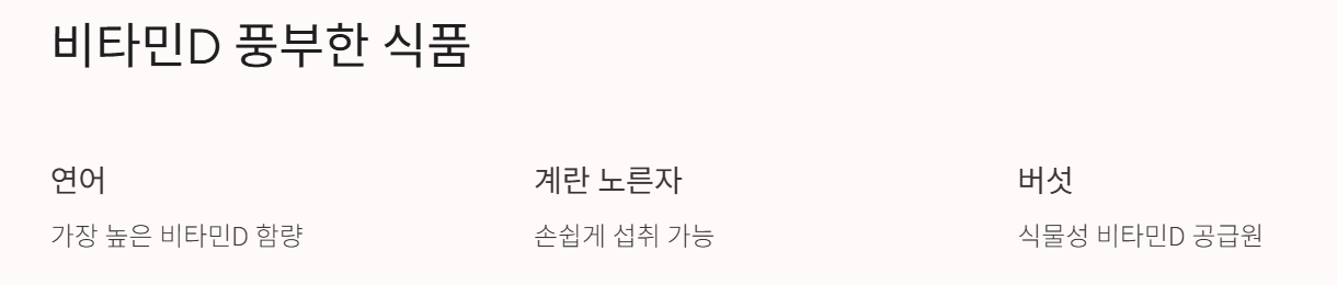 - 음식으로 섭취: 연어, 고등어, 계란 노른자, 버섯, 우유