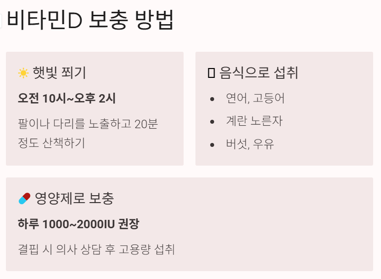 - 영양제로 보충: 하루 1000~2000IU 권장, 결핍 시 의사 상담 후 고용량 섭취