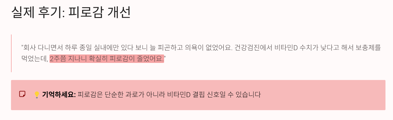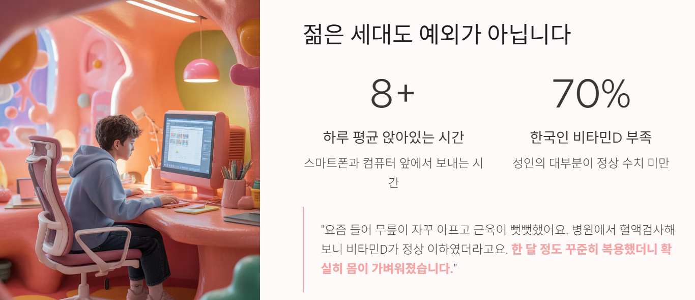 “회사 다니면서 하루 종일 실내에만 있다 보니 늘 피곤하고 의욕이 없었어요. 건강검진에서 비타민D 수치가 낮다고 해서 보충제를 먹었는데, 2주쯤 지나니 확실히 피로감이 줄었어요.”