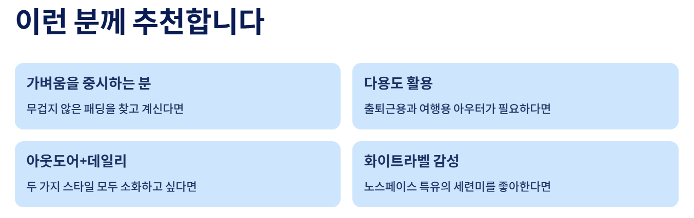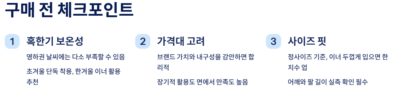 일부 사용자 후기에 따르면 “비슷한 기능의 경량패딩보다 다소 높은 가격대”라는 의견도 있습니다. 하지만 브랜드 가치와 내구성을 고려하면 가격대비 충분히 만족스러운 제품이라는 평이 더 많습니다.