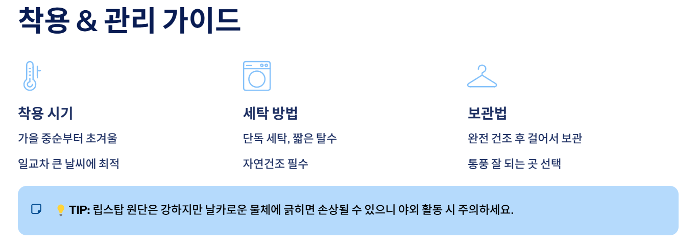 - 착용 시기: 가을 중순~초겨울, 일교차 큰 날씨에 최적