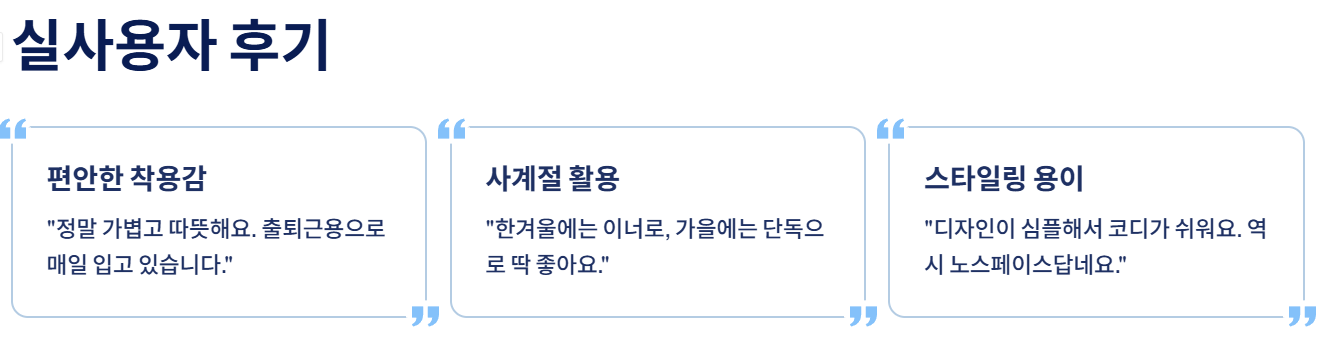 “정말 가볍고 따뜻해요. 출퇴근용으로 매일 입고 있습니다.”