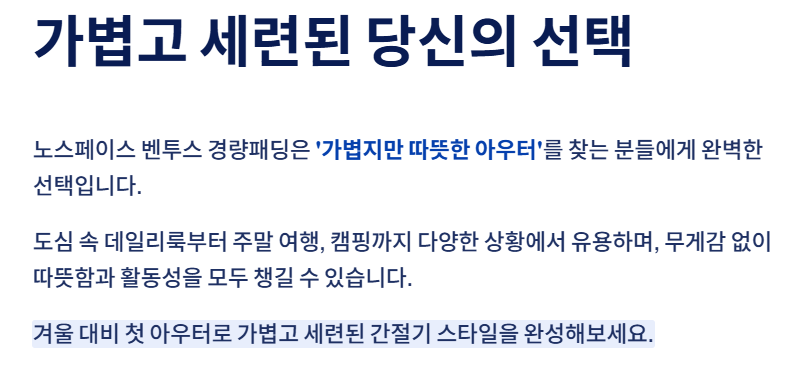 노스페이스 벤투스 경량패딩은 ‘가볍지만 따뜻한 아우터’를 찾는 분들에게 매우 추천할 만한 제품입니다.
