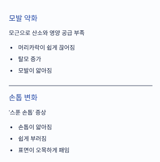 또한 손톱이 얇아지거나 쉽게 부러지고, 손톱 표면이 오목하게 패이는 ‘스푼 손톱’이 생기기도 합니다.