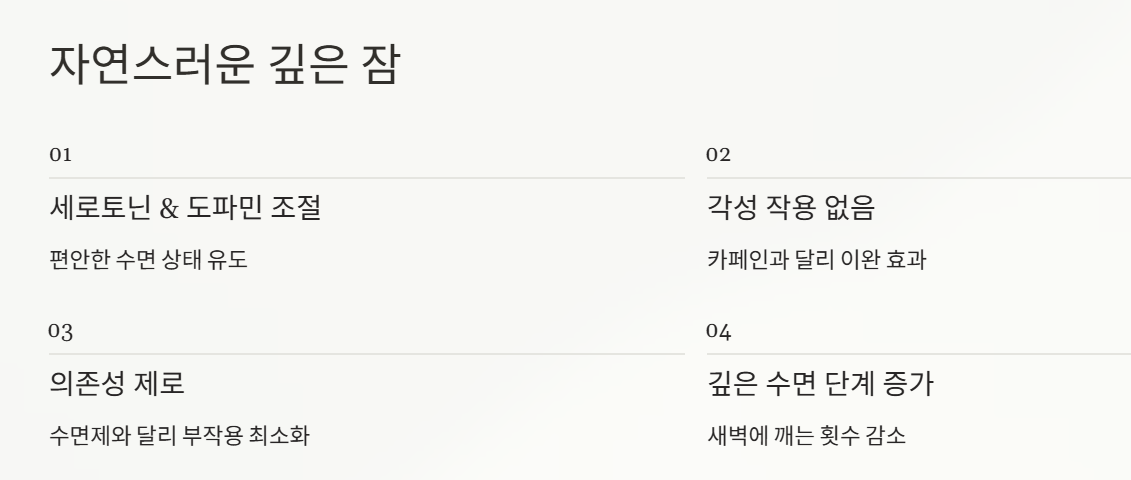 수면제와 달리 의존성이나 부작용이 거의 없기 때문에 자연스럽게 깊은 잠을 유도하는 것이 장점입니다.