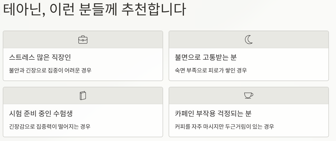 “커피를 마시면 심장이 두근거려서 힘들었는데, 테아닌을 같이 먹으니까 불안감이 확 줄었어요.