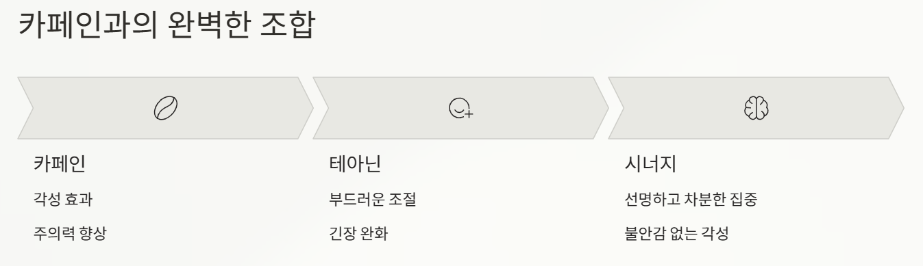 커피나 녹차 속 카페인이 각성을 돕는다면, 테아닌은 그 각성을 부드럽게 조절해 선명하면서도 차분한 집중 상태를 만들어줍니다.