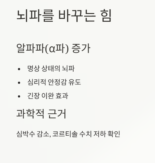 알파파는 명상이나 휴식을 취할 때 활성화되는 뇌파로, 긴장을 풀고 마음의 안정을 유도합니다.