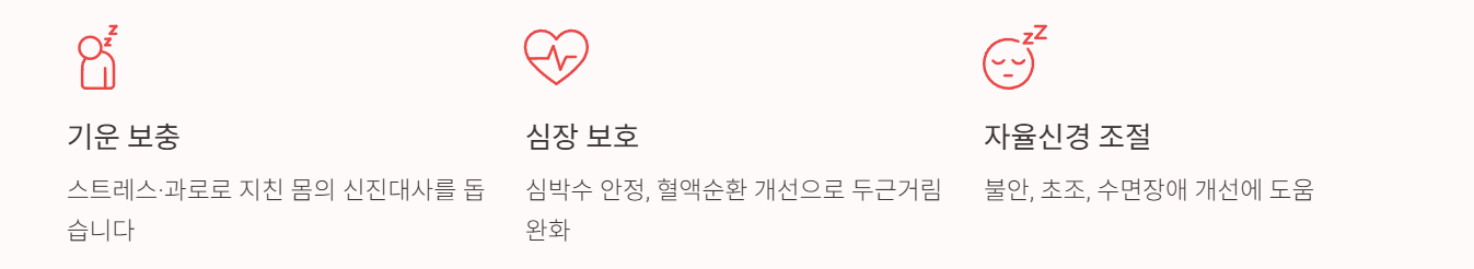 - 심장 보호 작용: 심박수 안정, 혈액순환 개선 효과가 있어 과로로 인한 두근거림을 완화시켜 줍니다.