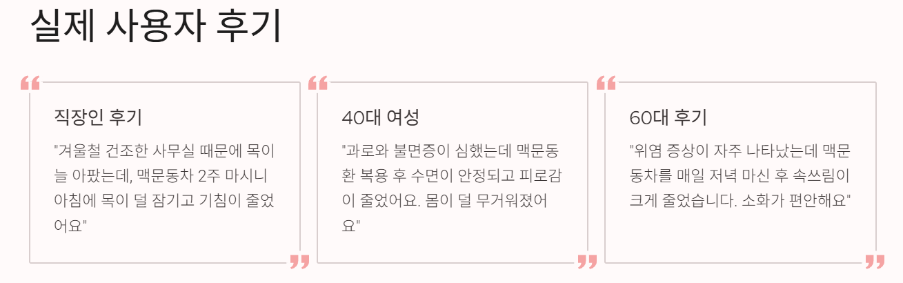 – 직장인 후기: 겨울철 건조한 사무실 공기 때문에 목이 늘 아팠는데, 맥문동차를 2주 정도 마시니 개선됐다고 합니다. - “피로감이 줄고 잠이 깊어졌어요.”