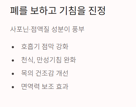 - 기침 완화: 천식, 만성기침, 목의 건조감 개선에 도움이 됩니다.