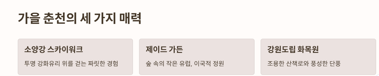 춘천 가을 여행은 자연 + 산책 + 전망 + 감성 카페를 적절히 섞는 게 최고예요. 위 세 곳(스카이워크, 제이드가든, 화목원)은 각기 다른 매력을 가진 장소라 함께 여행 코스로 묶으면 계절감이 풍부하게 느껴질 거예요.