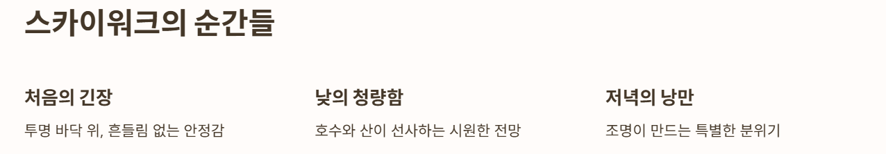 - 실제로 투명 바닥 위를 걸을 때는 처음에 조금 긴장되지만, 흔들림이 거의 없고 구조가 안정적이라는 평이 많아요.