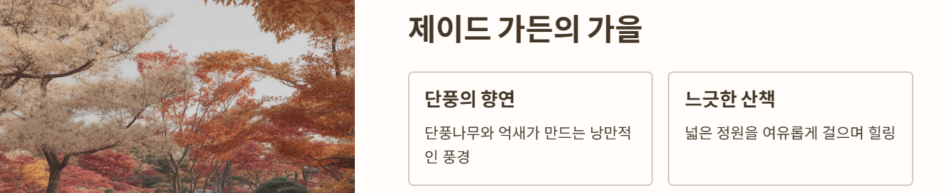 - 가을에는 단풍나무, 억새 등이 정원을 덮어 매우 낭만적인 풍경을 선사해요.