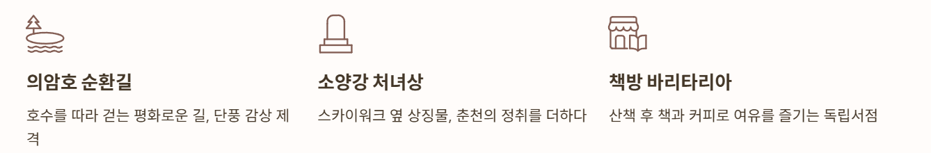 춘천에서 위 세 곳을 중심으로 하루 또는 반나절 코스를 짤 때 고려해볼만한 연계 장소도 몇 개 있어요.
