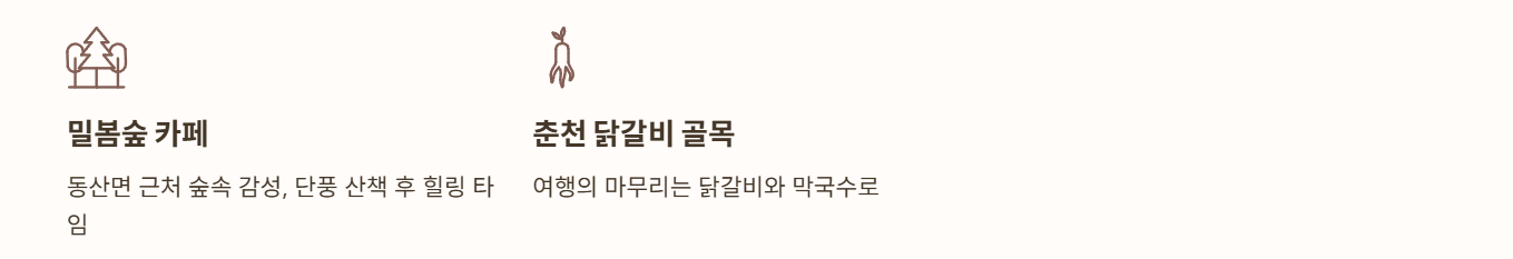 - 밀봄숲 카페: 춘천 동산면 근처에 있는 숲속 감성 카페로, 가을 단풍 산책 후 들르면 힐링 타임으로 딱입니다.