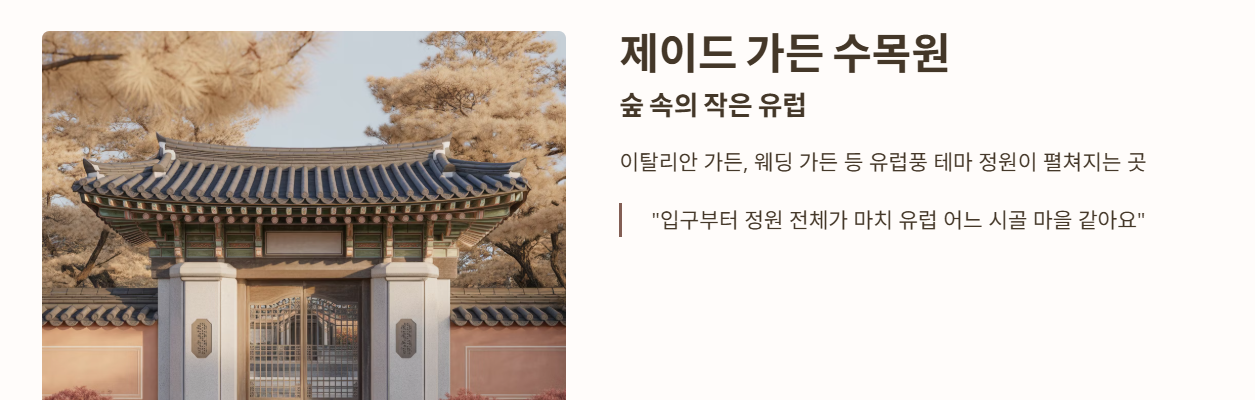 - 추천 포인트: “숲 속의 작은 유럽”이라는 콘셉트로 꾸며진 이국적인 정원이에요. 유럽풍의 테마 정원(이탈리안 가든, 웨딩 가든 등)과 다양한 수목이 있어서 가을 단풍이 정말 아름답게 물들죠.