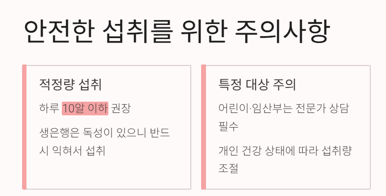 은행은 하루 10알 이하만 권장됩니다. 특히 생은행은 독성이 있으니 반드시 익혀서 섭취해야 합니다. - 어린아이·임산부는 전문가와 상담 후 섭취하는 것이 안전합니다.