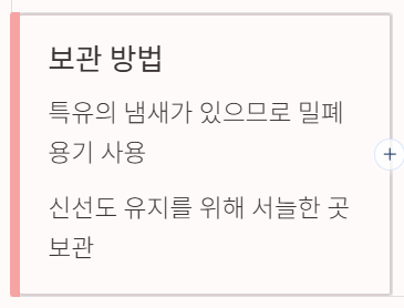- 특유의 냄새가 있으므로 보관 시 밀폐 용기를 사용하는 것이 좋습니다.