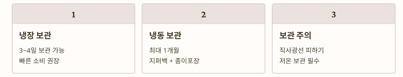 - 냉동 시 비닐보다 지퍼백 + 종이포장을 함께 사용하면 냄새와 산패를 막을 수 있음