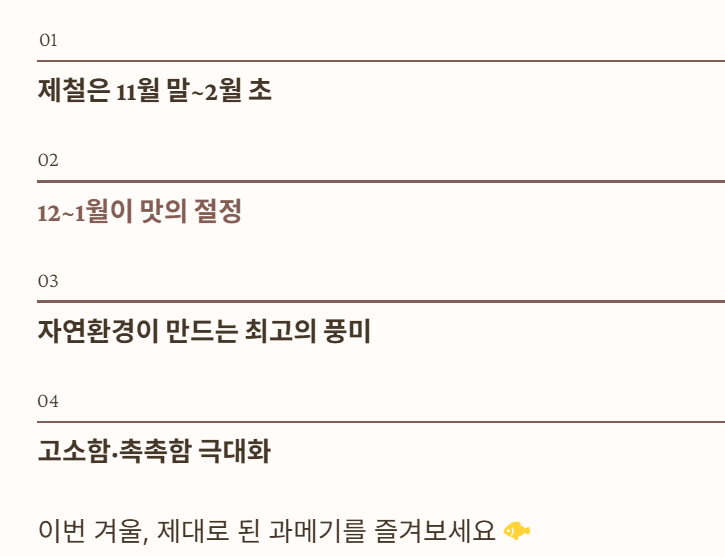 특히 12월~1월이 풍미가 가장 뛰어난 시기로 평가됩니다.