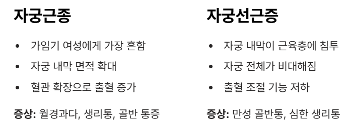- 주요 증상: 월경과다, 극심한 생리통, 골반 통증, 빈뇨 등.