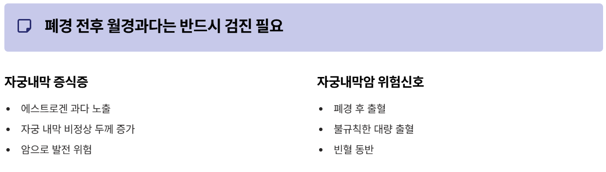 - 증상 특징: 특히 폐경 전후 여성에게서 월경과다가 나타난다면 반드시 암 검진을 받아야 합니다.