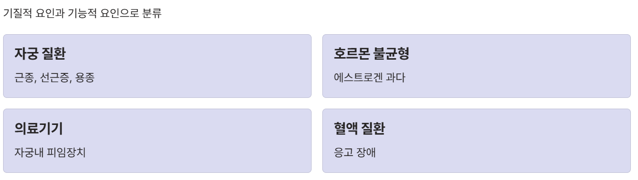 - 기능적 원인: 에스트로겐과 프로게스테론 같은 성 호르몬의 불균형으로 배란이 규칙적으로 일어나지 않는 '무배란성 주기'일 때 발생합니다.