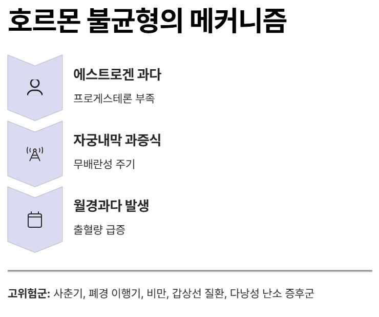 - 심각한 원인: 호르몬 불균형(에스트로겐 과다)으로 인해 자궁 내막이 비정상적으로 두꺼워진 상태입니다. 단순 증식증도 월경과다를 유발하며, 이는 자궁내막암으로 발전할 위험이 있어 주의가 필요합니다.