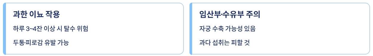하루 3~4잔 이상 마시면 몸에서 수분이 빠져나가 피로감·두통이 생길 수 있습니다.