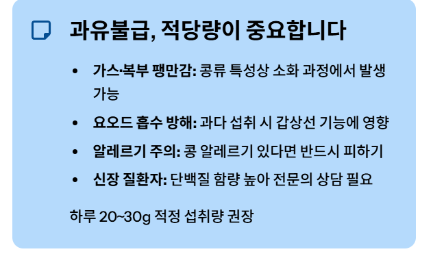 콩류 특성상 소화 과정에서 가스가 발생하여 더부룩함을 느낄 수 있습니다. - 요오드 흡수 방해 가능성