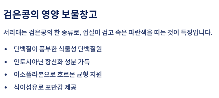 하지만 과다 섭취 시 복부 팽만이나 알레르기 위험이 있으므로 적정량을 지켜 꾸준히 섭취하는 것이 중요합니다. 일상 식단에 서리태밥·서리태 차 등을 자연스럽게 추가해 건강 관리에 활용해 보시길 추천드립니다.