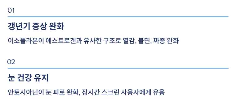서리태의 이소플라본은 여성 호르몬 에스트로겐과 유사한 구조를 가지고 있어 갱년기 증상 완화에 도움이 될 수 있습니다. 열감, 불면, 짜증 등 갱년기로 고생하는 여성들에게 긍정적인 보조 식품 중 하나로 알려져 있습니다.