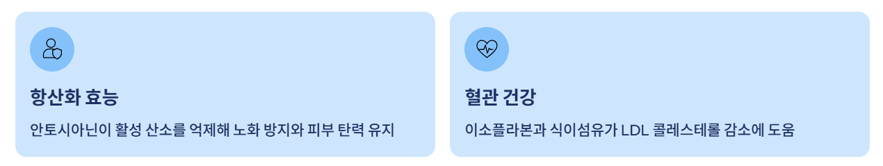 서리태 껍질에는 안토시아닌이 풍부합니다. 안토시아닌은 활성 산소를 억제해 세포 손상을 줄이는 데 도움을 주는 항산화 성분입니다. 노화 방지와 피부 탄력 유지에 긍정적일 수 있어 젊음을 유지하고 싶은 분들에게 인기 있습니다.