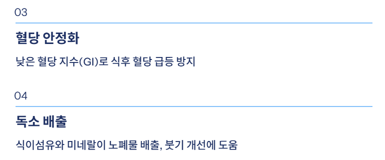 풍부한 식이섬유와 미네랄 성분은 노폐물 배출을 돕고 간의 부담을 줄이는 데 도움을 줄 수 있습니다. 붓기 개선과 피로 완화 효과를 경험하는 사람들이 많습니다.