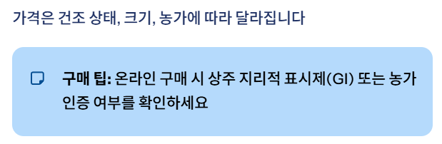 온라인 구매 시에는 상주 지리적 표시제(GI) 또는 농가 인증 여부를 확인하면 더욱 안전합니다.
