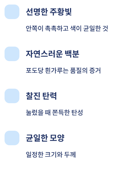 - 탄력 : 눌렀을 때 찰진 탄성을 느낄 수 있는 것이 우수