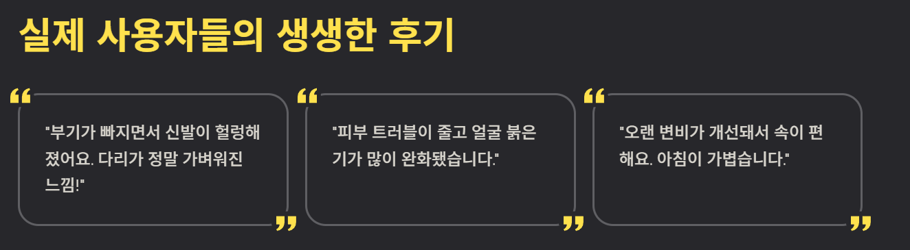 대체적으로 부기·순환·피부·장 관련 체감이 많았으며, 과다 섭취 시 장이 예민해짐이 공통된 후기입니다.