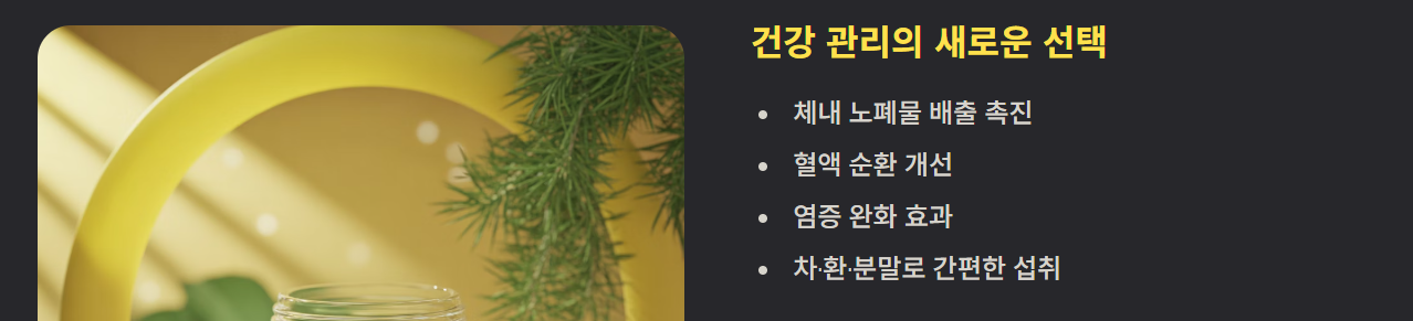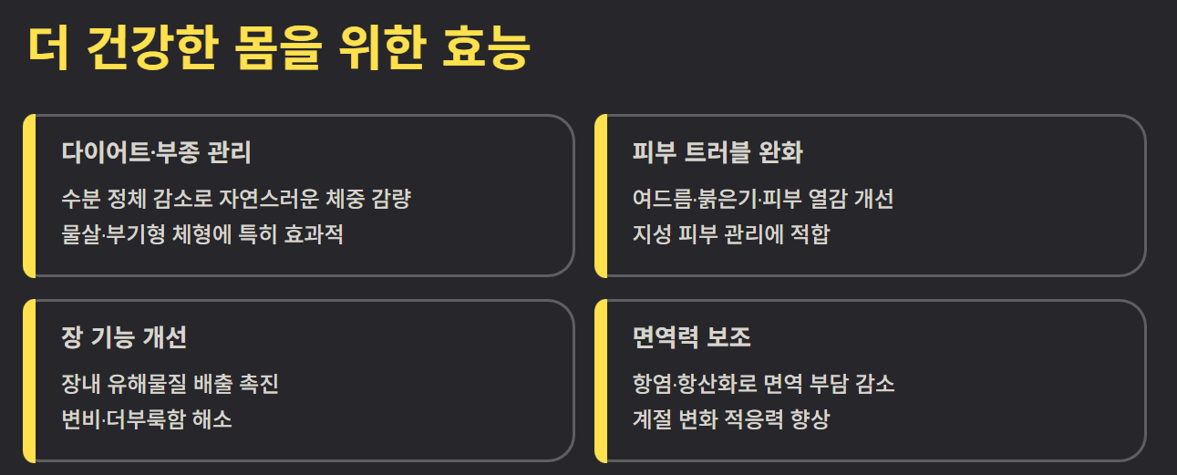 이뇨·해독 작용이 함께 작용해 체내 수분 정체가 줄어들면 체중도 자연스럽게 감소하는 경우가 있습니다. 지방을 직접 태우기보다는 물살 체형이나 부기형 체중 증가에 도움을 준다는 의견이 많습니다.