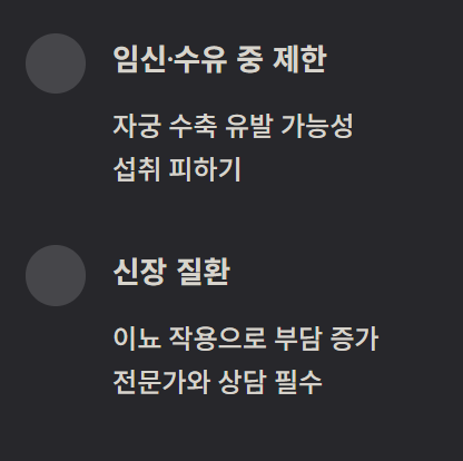자궁 수축을 유발할 가능성이 있어 일반적으로 권장되지 않습니다. - 신장 질환이 있는 경우 주의
