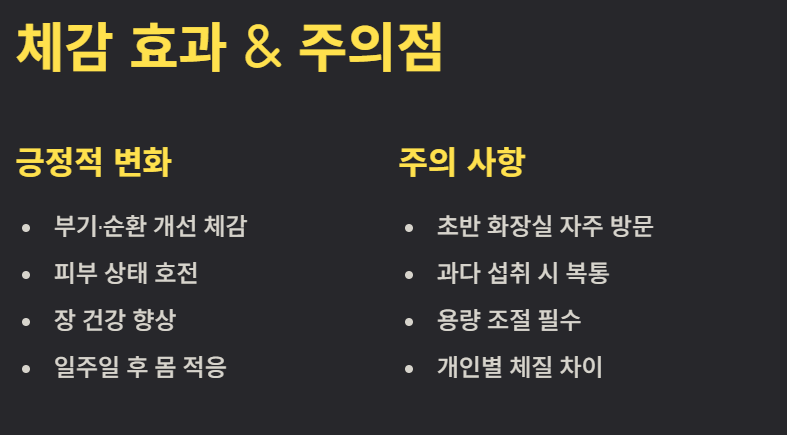 - “처음에는 화장실을 자주 가는 느낌이 있었지만 일주일 지나니 적응됨.”