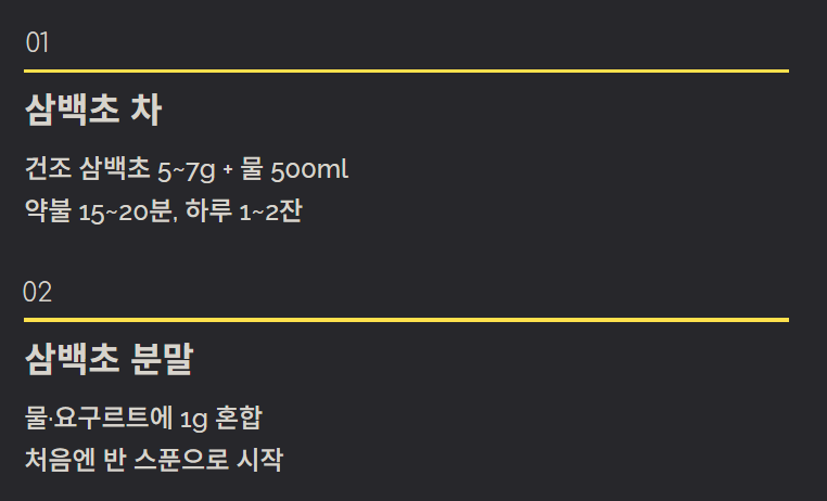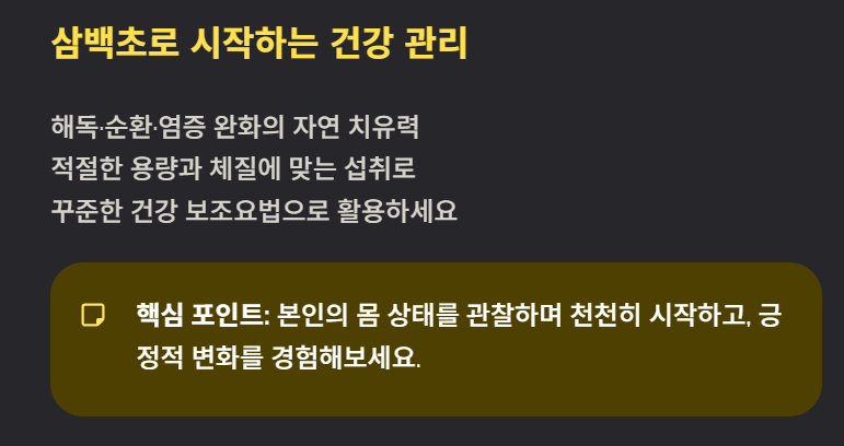삼백초는 해독, 순환 개선, 염증 완화, 부기 관리에 도움을 주는 유용한 약초입니다. 하지만 이뇨·해독 작용이 강한 만큼 적절한 용량을 지키고, 체질에 맞게 천천히 섭취하는 것이 중요합니다. 본인의 몸 상태에 맞게 조절한다면 꾸준한 건강 보조요법으로 충분히 활용할 수 있는 식재료입니다.
