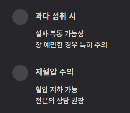 이뇨 작용이 신장에 부담을 줄 수 있으므로 섭취 전 확인이 필요합니다.