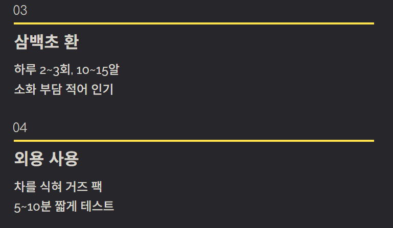 삼백초는 장내 유해물질 배출과 장 정화에 도움을 준다고 알려져 변비, 장 더부룩함 개선에도 긍정적인 영향을 줄 수 있습니다. 장 예민한 사람들 사이에서도 비교적 잘 맞는 편입니다.