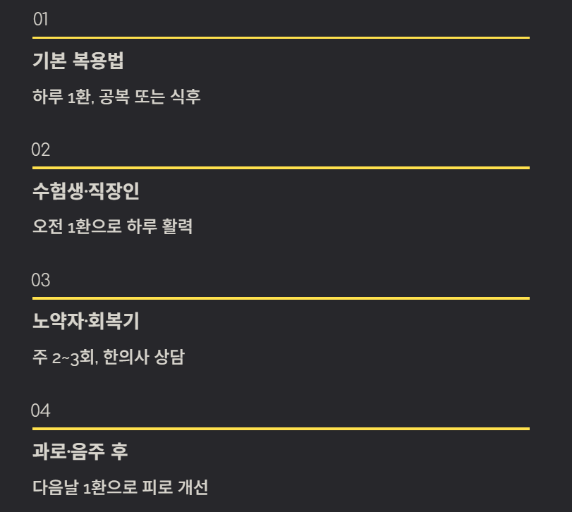 - 수험생·직장인 피로 누적 시 → 오전에 1환 복용