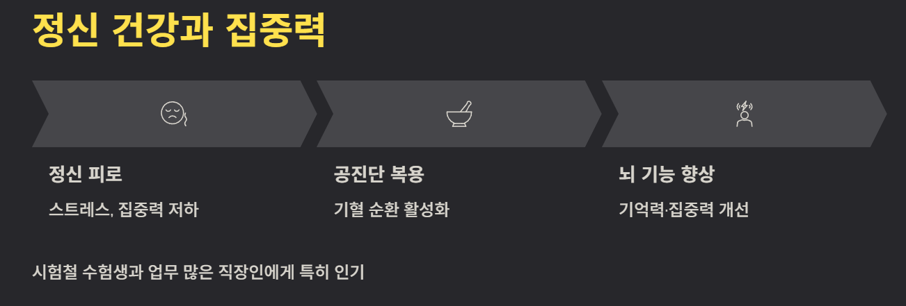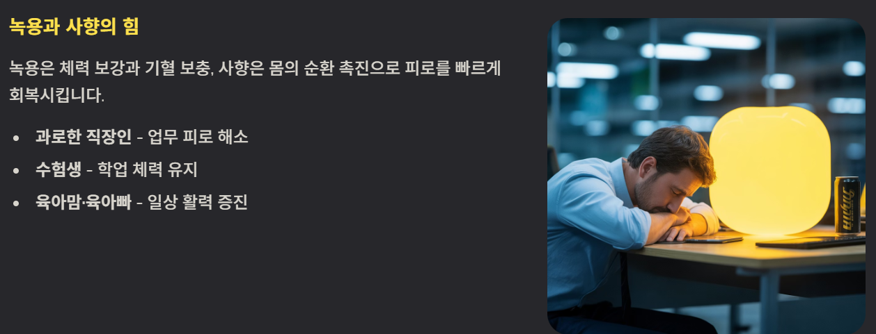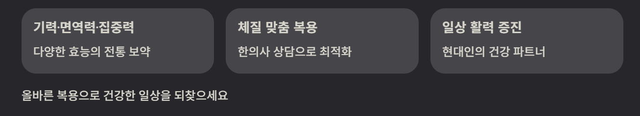 최근에는 피로 누적, 스트레스, 집중력 저하, 잦은 감기 등으로 고민하는 현대인들이 많이 찾는 건강 보약으로 다시 주목받고 있습니다.