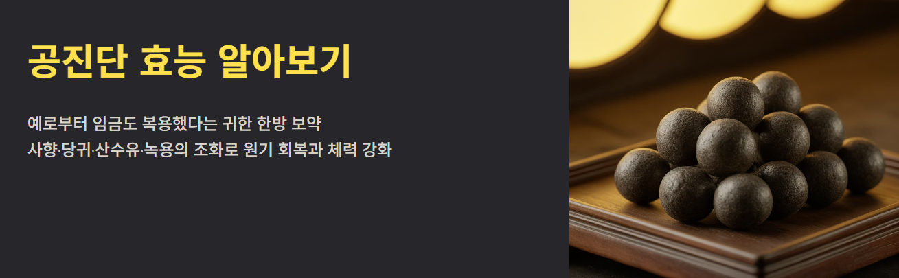 공진단은 기력 회복, 면역력 강화, 집중력 향상 등 다양한 효과로 피곤한 현대인에게 많은 사랑을 받고 있는 전통 보약입니다.