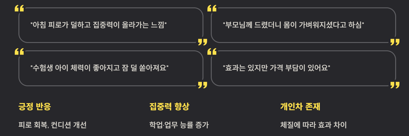대체로 피로 회복, 컨디션 개선, 집중력 향상에 대해 긍정적인 후기가 많지만, 개인 체질에 따라 차이가 있다는 평가도 많습니다.